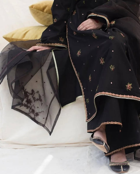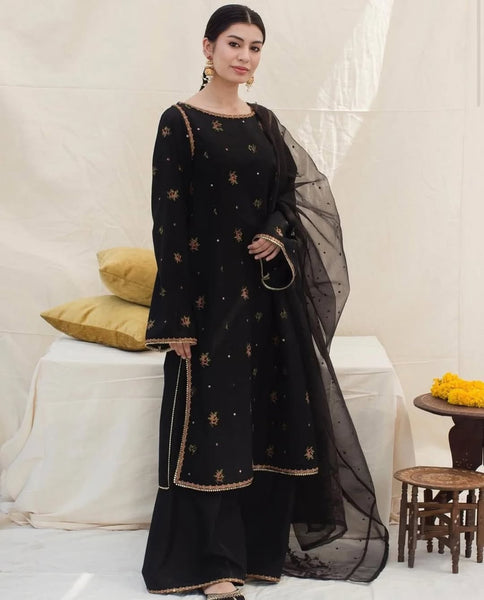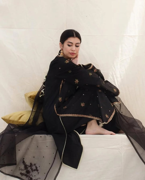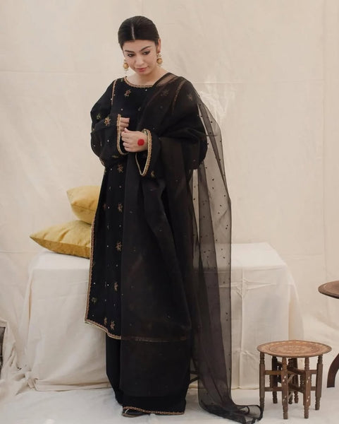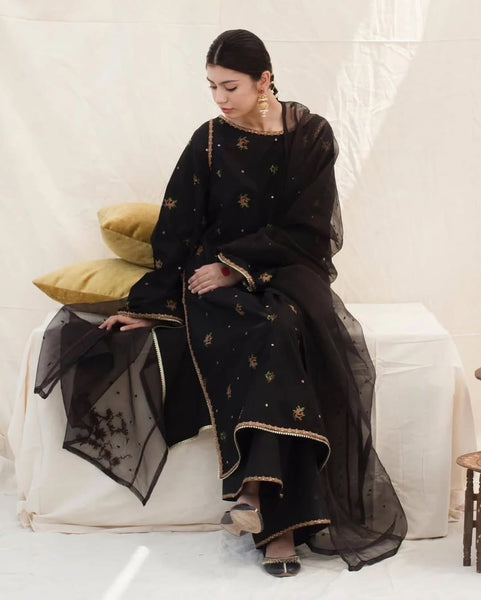 Step into sophistication with Black Stone, a luxurious 4-piece organza tilla embroidery dress designed for summer elegance. Featuring a fully embroidered organza front with intricate tilla work and a beautifully crafted neckline, this outfit defines festive charm. The matching organza tilla-embroidered dupatta adds a delicate flair, making it ideal for summer weddings, Eid, or festive gatherings.