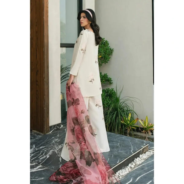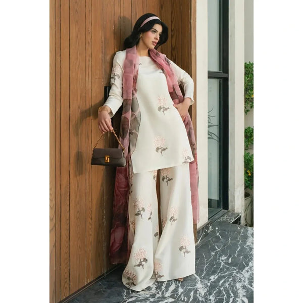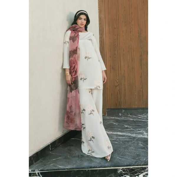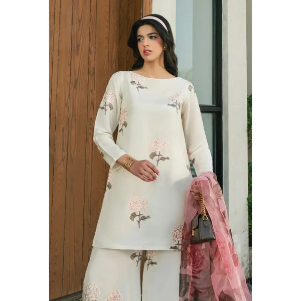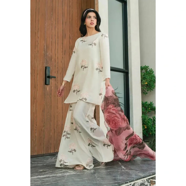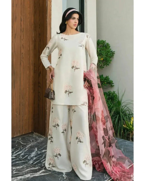 ✨ Why You’ll Love It: – Soft & Breezy Premium Lawn Fabric – Elegant Pastel Off-White Color – Beautiful Printed Short Shirt & Plazzu – Graceful Printed Organza Dupatta – Available in Both Stitched & Unstitched