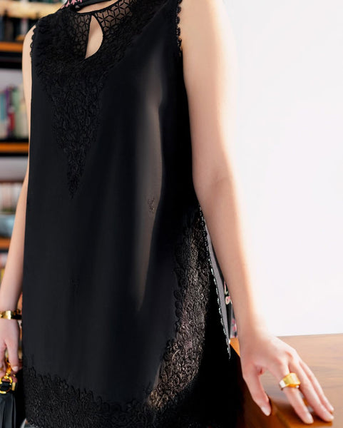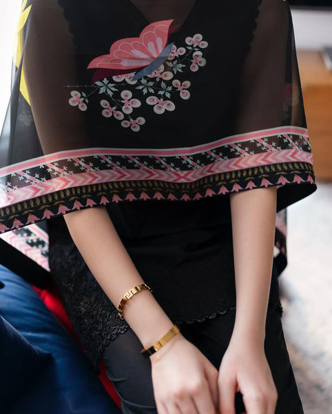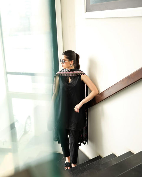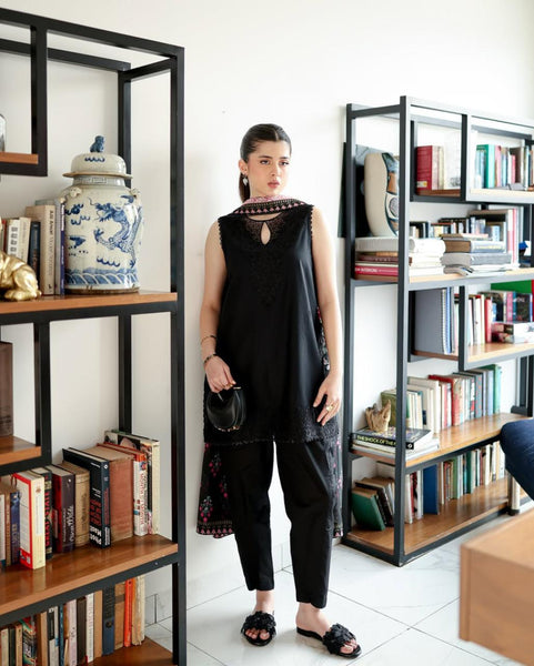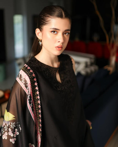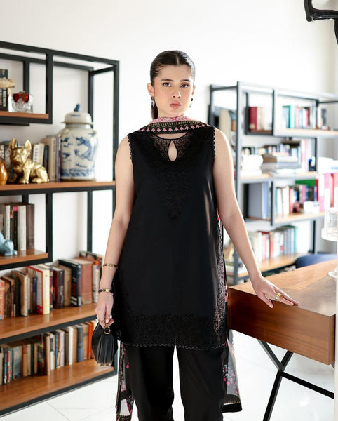 Step into timeless sophistication with our Mehmal 3-piece lawn dress, beautifully designed in classic black. The shirt features delicate embroidery on premium lawn, paired with a sleek cigarette shalwar for a modern twist. Completing the ensemble is a stunning printed organza dupatta that adds a graceful statement to this bold yet refined outfit – ideal for evening wear or day-to-night styling.