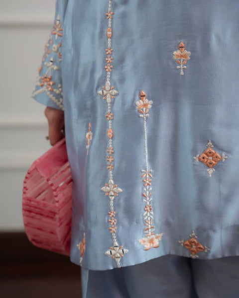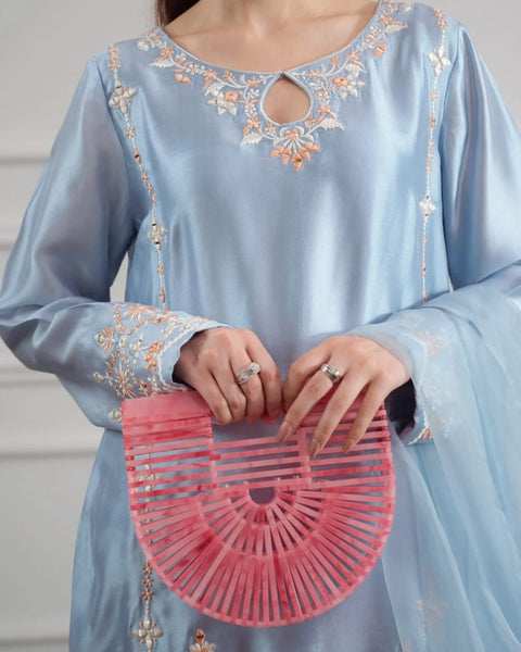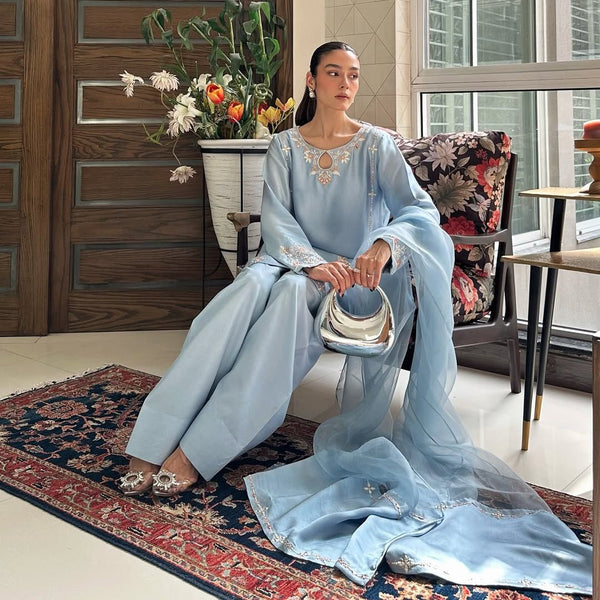 💫 Timeless Elegance with a Sparkle Step into timeless charm with Anara – a beautifully crafted 3-piece silk ensemble that blends traditional artistry with contemporary finesse. Adorned with intricate embroidery, delicate sheesha work, and sequins on the short shirt, this outfit features a graceful farshi shalwar and a statement organza dupatta finished with exquisite pallu detailing.