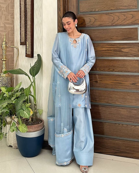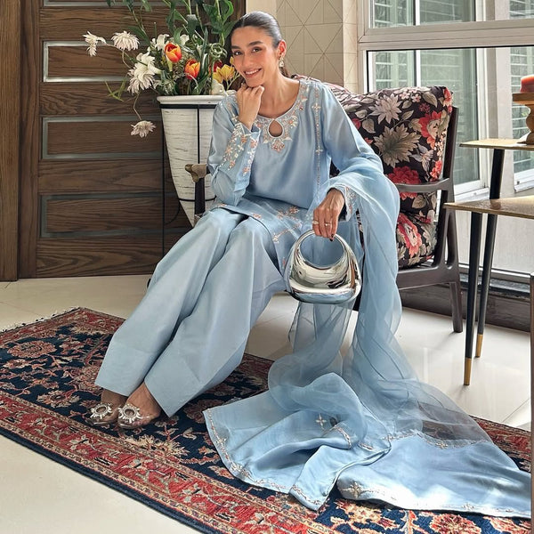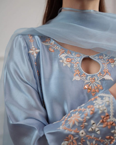✨ What Makes Anara Special: – Premium Silk with Rich Embroidery Finish – Sheesha & Sequin Detailing on Shirt for a Luxe Sparkle – Farshi Shalwar for a Flowing, Regal Silhouette – Organza Dupatta with Heavily Worked Pallu Ends – Ideal for Weddings, Festive Gatherings & Celebrations