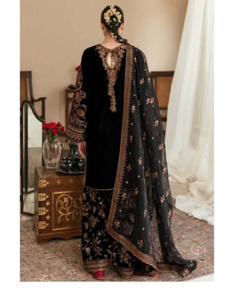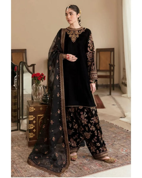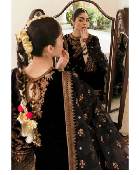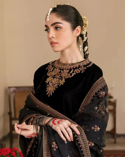 Step into luxury with this stitched black velvet dress, designed to captivate. The stunning embroidery details exude sophistication, while the matching Organza dupatta completes the ensemble with a graceful touch. Whether for a wedding or a festive evening, this dress is your go-to for elegant style.